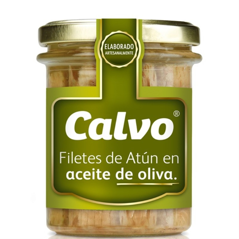 Filetes de atún en aceite de oliva Calvo tarro vidrio 180g Filets de tonyina en oli d'oliva Calvo pot vidre 180g Filetes de atún en aceite de oliva bote de vidro Calvo 180g Hegaluze xerrak oliba oliotan Calvo beirazko potea 180g