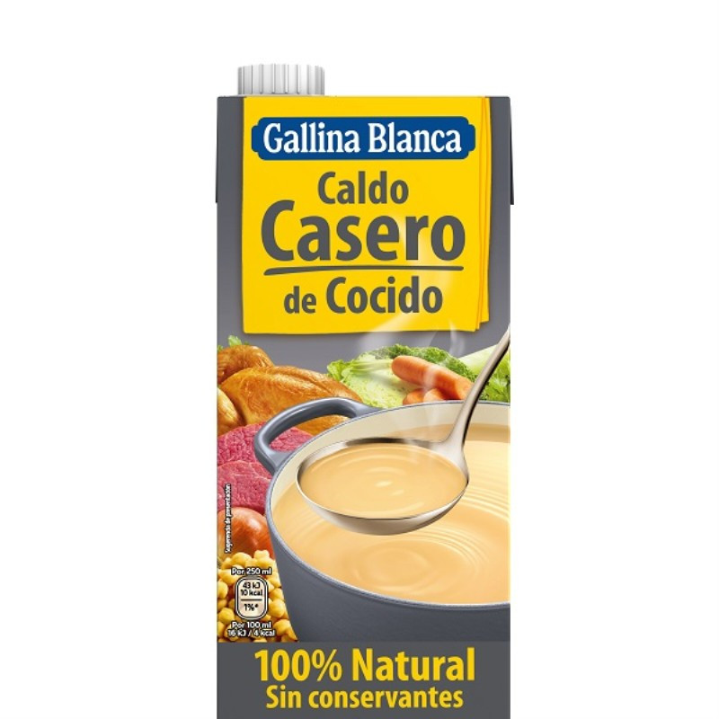 Agua, ternera (2,5%), pollo (1,2%), cerdo (0,6%), APIO (0,3%), patata (0,2%), col (0,2%), garbanzos (0,2%), puerro (0,1%), zanahoria (0,1%), cebolla (0,1%), grasa de cerdo, aromas naturales (contienen LECHE y HUEVO), sal, especias.