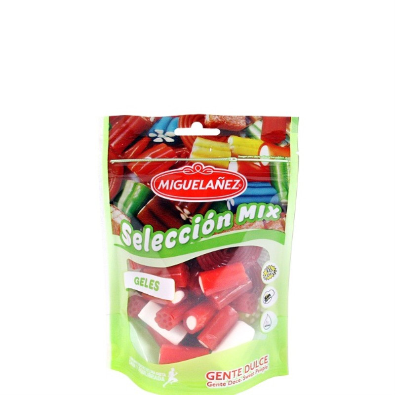 Jarabe de glucosa-fructosa, azúcar, água, harina de TRIGO (contiene gluten), almidón de maíz, dextrosa, acidulantes: E270, E296, E330, grasa de palma(palma, coco), gelatina, correctores de acidez: E331(iii), E325, aromas, aceites vegetales(coco, palma), sal, emulgente: E471, conservador: E202, colorantes: E100, E120, E-120(i), E133, E150d, E-162, agentes de recubrimiento: cera de abejas, goma laca y cera de carnauba. Puede contener trazas de SOJA y MOSTAZA