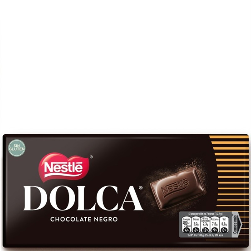 Tableta de chocolate negro NESTLÉ DOLCA. Un chocolate cremoso para los más intensos y apto para una dieta sin gluten.
