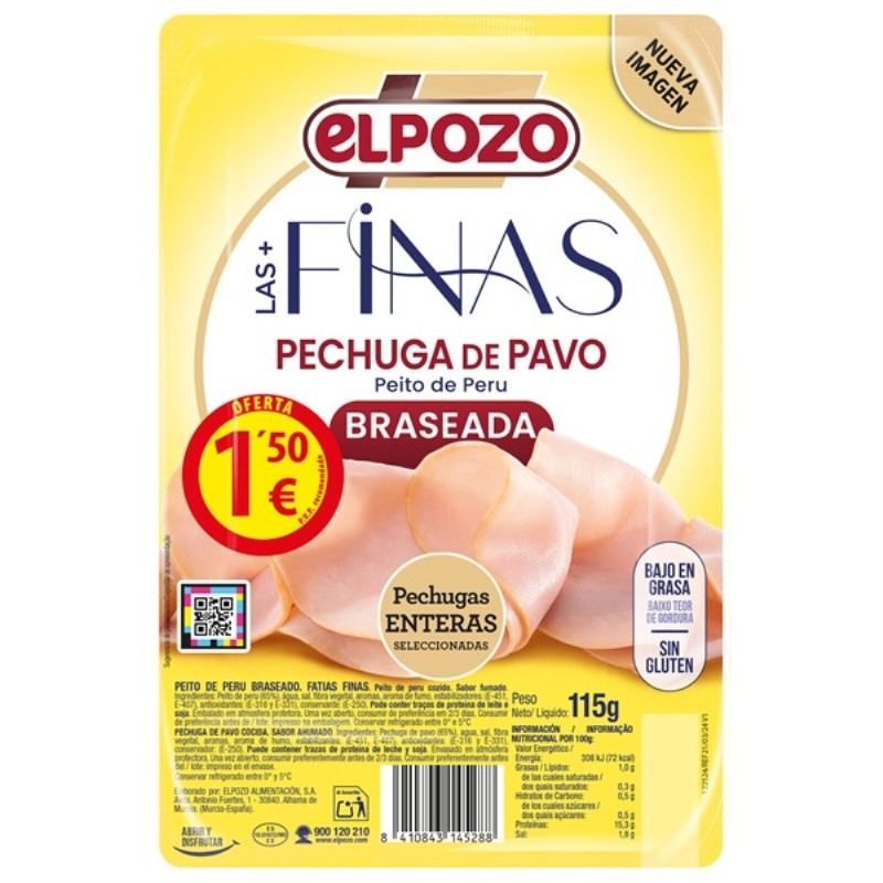Pechuga de pavo (65%), agua, sal, fibra vegetal, aromas,aroma de humo, estabilizantes (E-451, E-407), antioxidantes (E-316, E-331),conservador (E-250). Puede contener TRAZAS DE PROTEÍNA DE LECHE Y SOJA. Envasado en atmósfera protectora