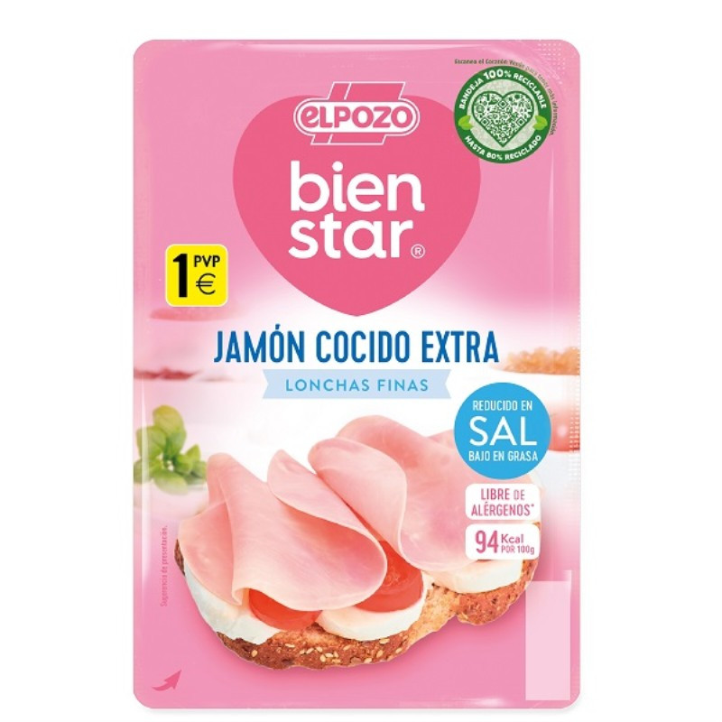 Jamón de cerdo (85%), agua, sal, dextrosa de maíz, aromas, estabilizantes (E-407, E-450 y E-420), antioxidantes (E-301 y E-331), conservador (E-250). Envasado en atmósfera protectora