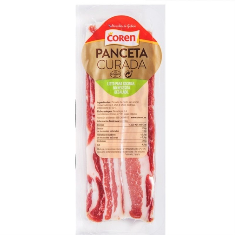 Panceta fresca de cerdo, sal, azúcar, conservadores (E-252, E-250), dextrosa, antioxidante (E-301)