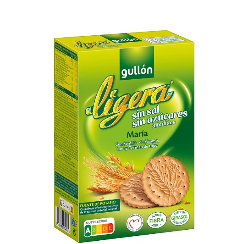 Harina de trigo 64%, fibra vegetal, aceite vegetal (girasol alto oleico) 9%, edulcorante (maltitol), semillas de sésamo 5%, salvado de trigo, harina de soja, gasificantes (carbonato ácido de potasio, carbonato ácido de amonio), proteína de soja, emulgente (lecitina de soja), germen de trigo 0,2%, semillas de lino 0,2%, antioxidante (metabisulfito potásico), aroma. Puede contener trazas de leche y mostaza. Con girasol alto oleico.