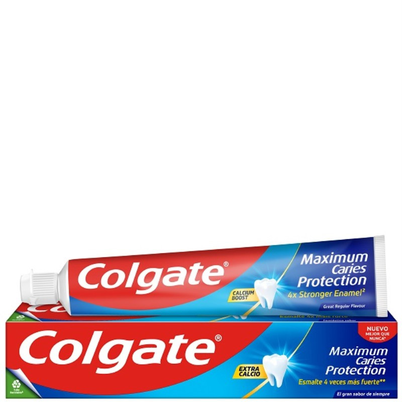 La pasta de dientes Colgate Maximum Caries Protection es nuestra mejor protección contra la caries para toda la familia. Esta pasta dentífrica con flúor tiene una fórmula con calcio diseñada para proteger los dientes de la caries. Además de proteger contra la caries, esta pasta de dientes con flúor tiene un sabor a menta y refresca el aliento para una sonrisa de confianza.