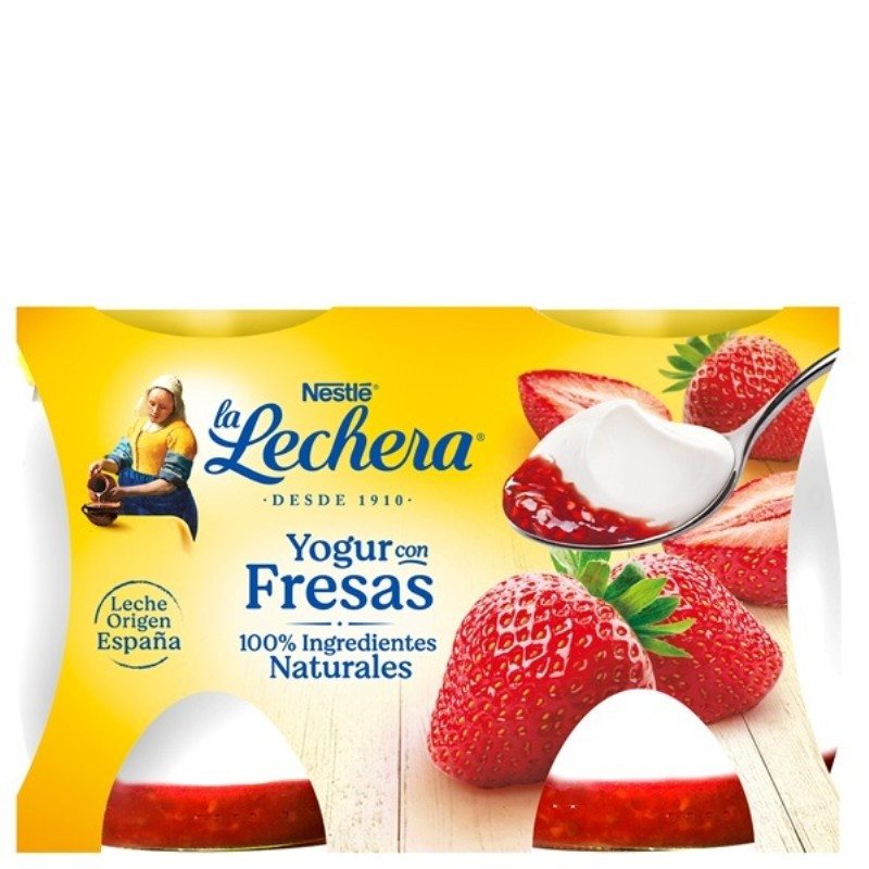 LECHE desnatada pasteurizada¹ (62%), azúcar, fresa (8%), NATA, agua, LECHE desnatada en polvo, aroma natural, almidón concentrado de zanahoria negra, zumo concentrado de frutos rojos, sales minerales LÁCTEAS, fermentos LÁCTEOS. Origen de la leche: España. ¹Leche de vaca certificada en Bienestar Animal. 100% Ingredientes naturales