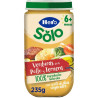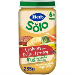 Verduras (65,8%) (patatas, judías verdes, zanahoria, tomate, guisantes y cebolla), agua de cocción, carne de pollo (7%), carne de ternera (3%), aceite de oliva virgen (1,7%) y arroz. Más 6 meses.