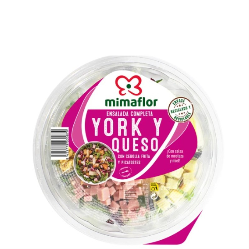 Ensalada mezclum (34%): Escarola rizada, brotes lechuga roja, radicchio, mizuna. Salsa mostaza y miel (29%): Agua, aceite vegetal*, mostaza 4% (agua, vinagre, mostaza 14%, sal fibra de mostaza, especias, estabilizantes: goma guar y goma xantana, aceite vegetal*, colorante: caramelo Ey150d, acidulante: ácido cítrico), azúcar, vinagre de vino, miel en polvo 2%, arándanos deshidratados 2%, yema de huevo, almidón modificado, sal, aroma, acidulante: ácido cítrico, esabilizador: goma xantana. *Aceite Girasol:AG o de soja ip: AS (Ver siglas junto a fecha de caducidad). Queso madurado (12%): Leche pasteurizada de vaca, sal, cuajo, fermentos lácticos. Tacos de york(14%): Magro de cerdo agua, fecula de patata, sal, proteína de soja, proteína de leche, dextrosa de maíz, lactosa, aromas, estabilizadores Ey415 y Ey407, conservador Ey200, antioxidantes Ey316, potenciador del sabor Ey6214, colorante natural Ey120. Cebolla frita (7%): cebolla, aceite vegetal, harina de trigo, agua, sal. Picatostes (5%): Harina de trigo, aceite de girasol, sal, aceite de colza, levadura. Contiene: Gluten, mostaza, huevo, leche y productos lácteos, soja, y derivados. Trazas de pescado, frutos de cascara, sesámo, cahachuetes y sulfitos.